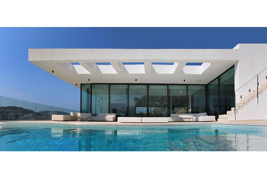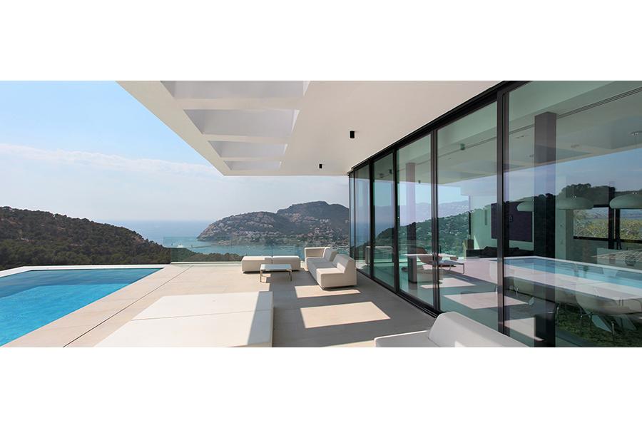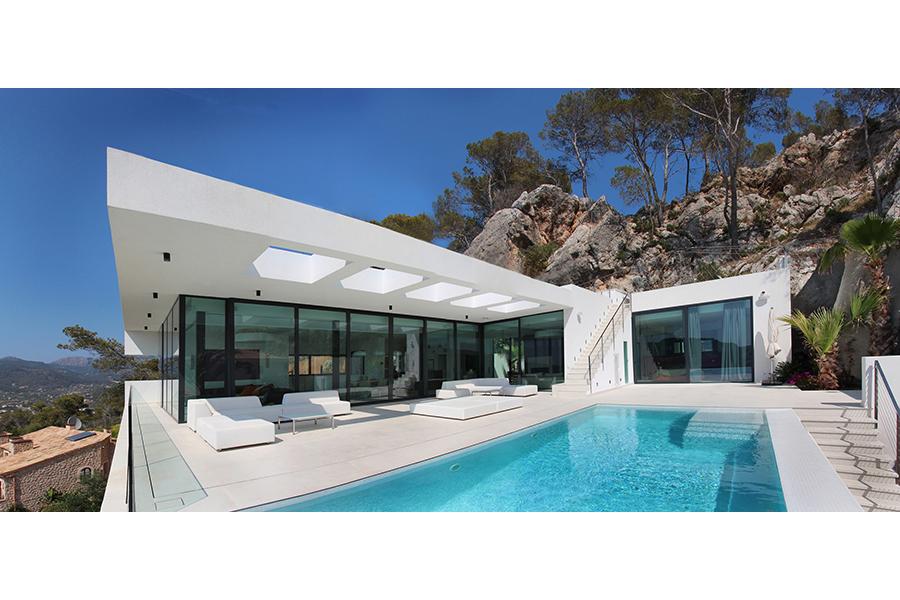 Se accede a la vivienda a través de un patio, que proporciona penumbra, descanso, recogimiento, que nos prepara par el tránsito desde el exterior hacia nuestro hogar. Desde este se puede acceder directamente a las plantas superiores por un ascensor que nos lleva directamente al "hogar"; o podemos realizar la ascensión por una escalera, que transita desde el exterior urbano hasta la montaña, pasando por la vivienda. La casa se abre al sur y al oeste. Se cierra con un pliegue al viento de tramuntana, característico de la zona. Pero ese pliegue tiene un corte horizontal, que a modo de cuadro, enmarca las magníficas vistas a la Serra de Tramuntana de Mallorca.